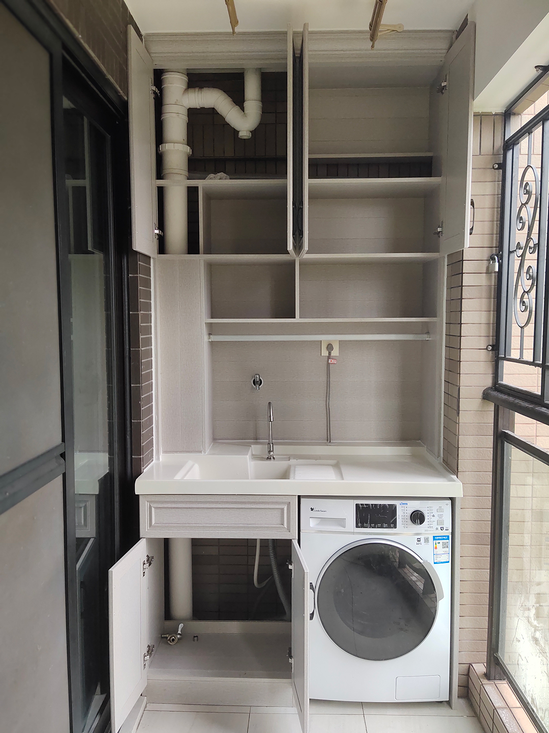定制的陽(yáng)臺(tái)柜,還可以在一定程度上隱藏一些陽(yáng)臺(tái)管道,讓陽(yáng)臺(tái)看起來更加美觀。