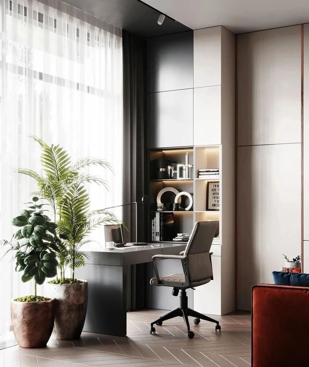 如果家里的儲(chǔ)物需求不大,我們可以利用陽(yáng)臺(tái)的布局,靠墻安裝書柜,再將書桌完美融合進(jìn)去,營(yíng)造出一個(gè)安靜舒適的工作學(xué)習(xí)區(qū)。封閉柜與開放格相搭配,收納與展示兩不誤,還不顯壓抑。這效果感覺白賺一間房有沒有!
