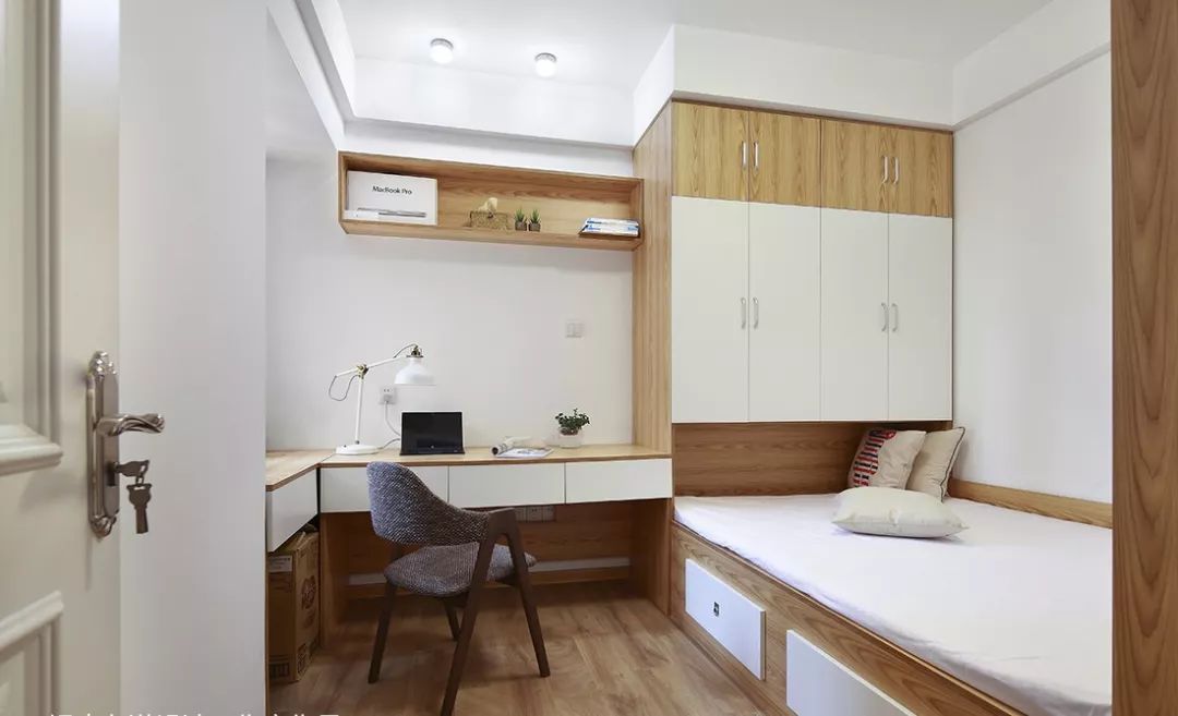 同樣是采用全鋁衣柜+全鋁書桌一體的設(shè)計,大量使用全鋁原木紋家具,營造出親近自然的氛圍。