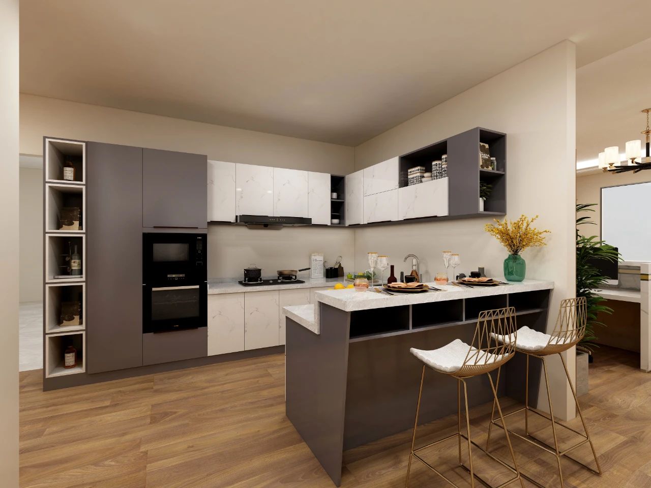 高級灰+高光魚肚白,封閉與開放格結(jié)合,精致的細(xì)節(jié)常常體現(xiàn)于色彩的呼應(yīng),在櫥柜的配件上,鋁師傅選用了銑型拉手,來實(shí)現(xiàn)顏值的進(jìn)一步提升和柜內(nèi)空間最大化。