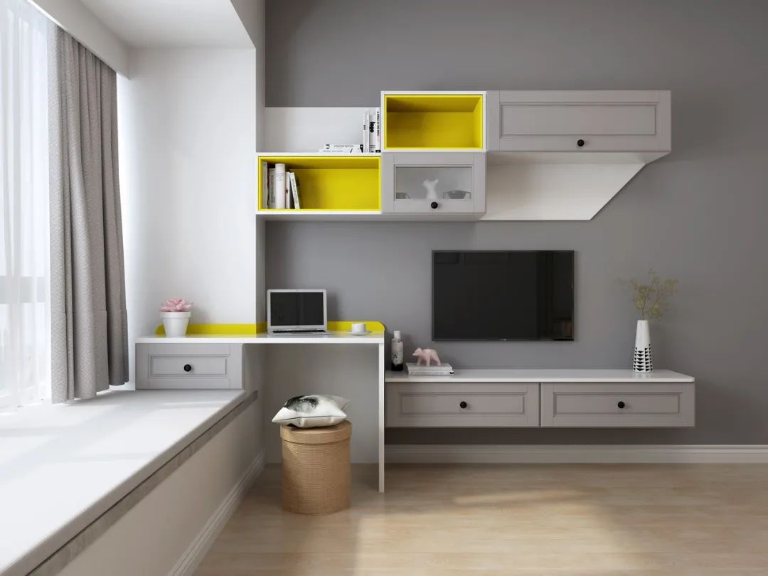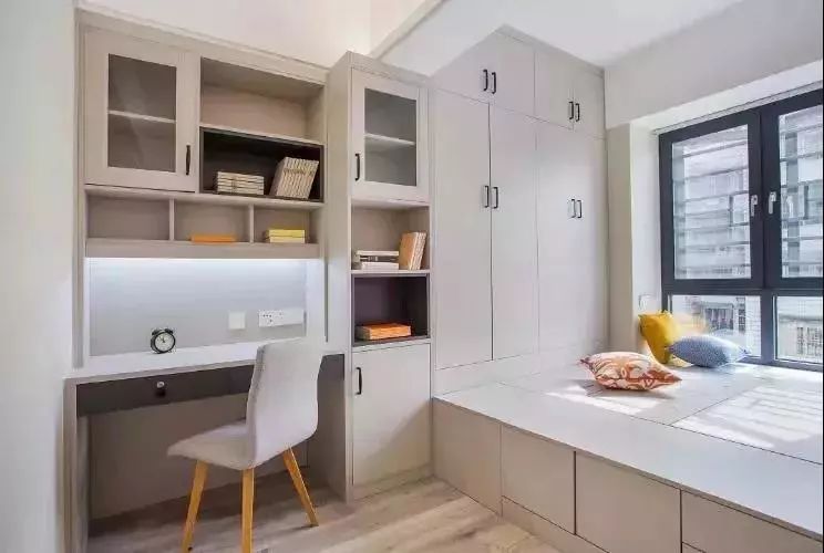 打造一個(gè)回型綜合飄窗柜,可以衣柜+書(shū)桌柜結(jié)合,也可以書(shū)桌柜結(jié)合,效果都不錯(cuò)。