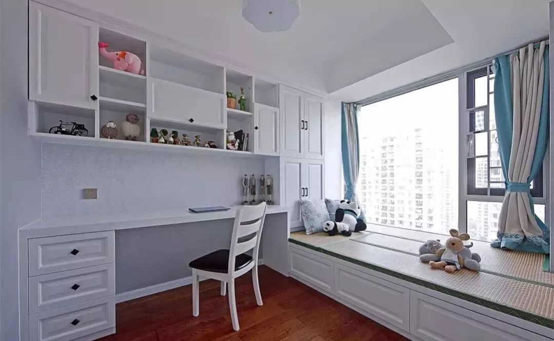 在極有限的兒童房空間里,我們常會(huì)把衣柜和書桌、書柜做一體定制。
