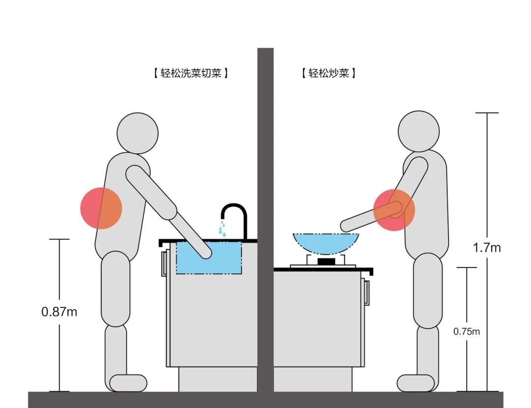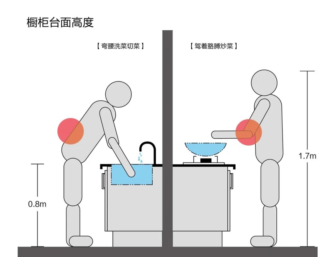 如果把廚房做成統(tǒng)一高度,那么洗菜時(shí)會(huì)因?yàn)樗鄹叨忍涂偸且獜澭?,而灶具在灶臺(tái)之上,炒菜時(shí)總是要架著胳膊,時(shí)間一久,就會(huì)導(dǎo)致腰酸胳膊痛。