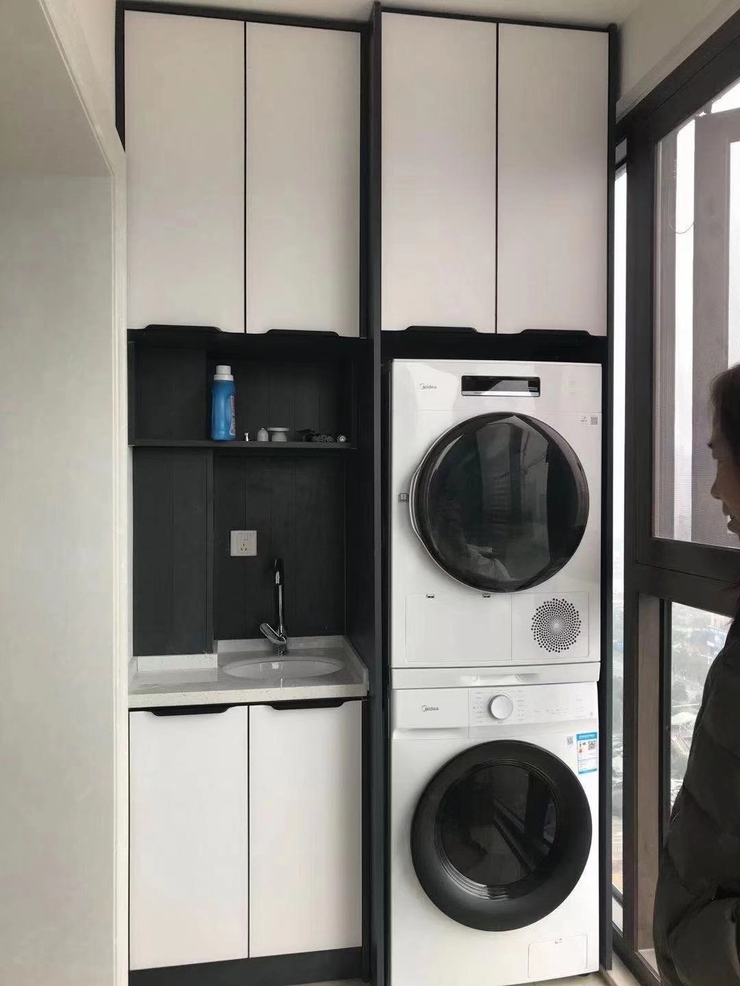 洗衣機(jī),烘干機(jī)一起內(nèi)嵌到洗衣機(jī)里,這樣的全鋁陽(yáng)臺(tái)洗衣機(jī)柜美觀實(shí)用。千萬(wàn)要注意的是,將洗衣機(jī)放置在陽(yáng)臺(tái),一定要提前規(guī)劃好水管電路,預(yù)留好插座。洗衣機(jī)邊上的柜子一定要做好防水。