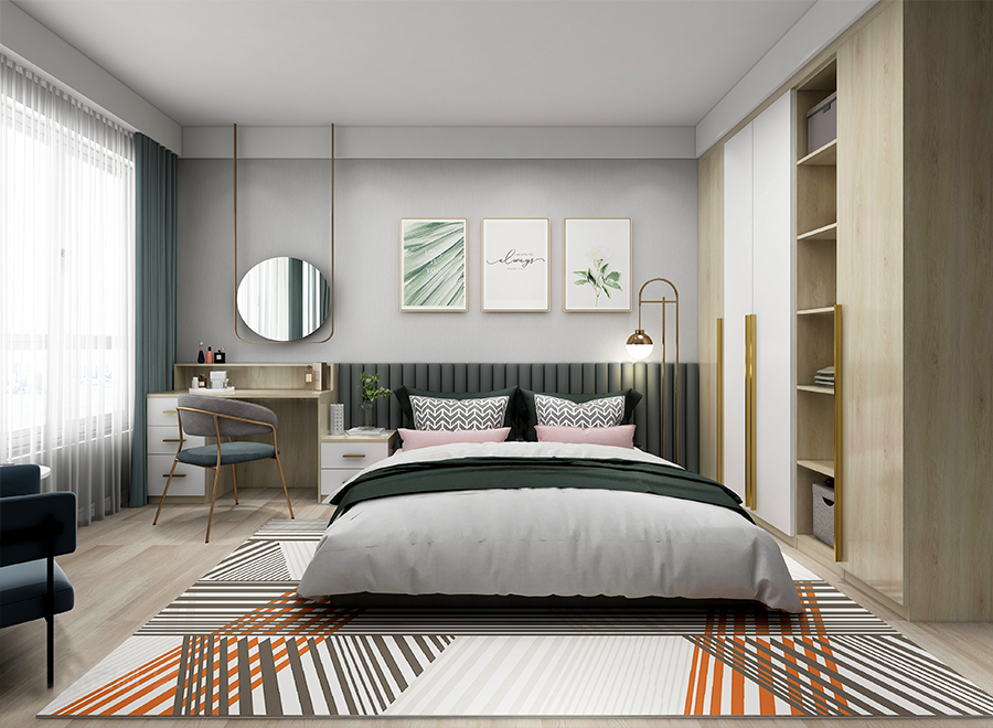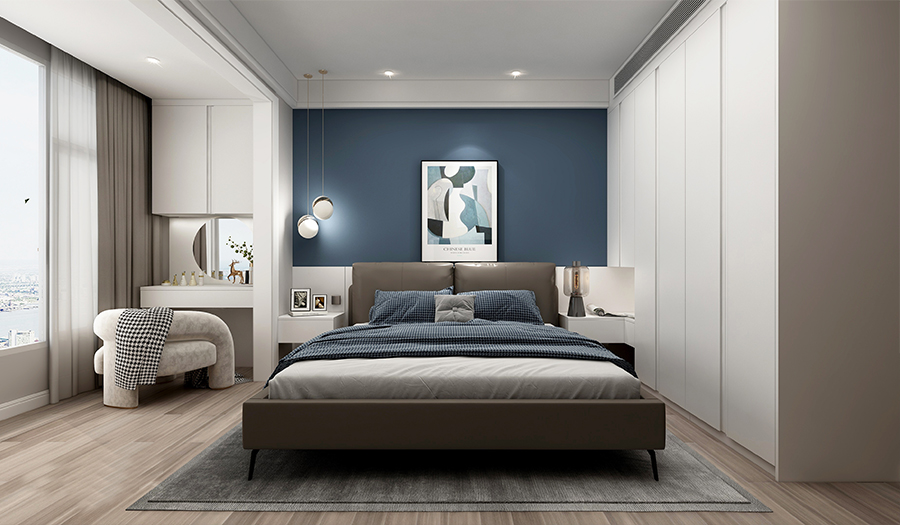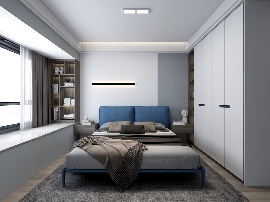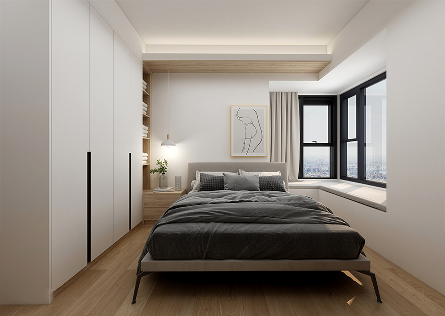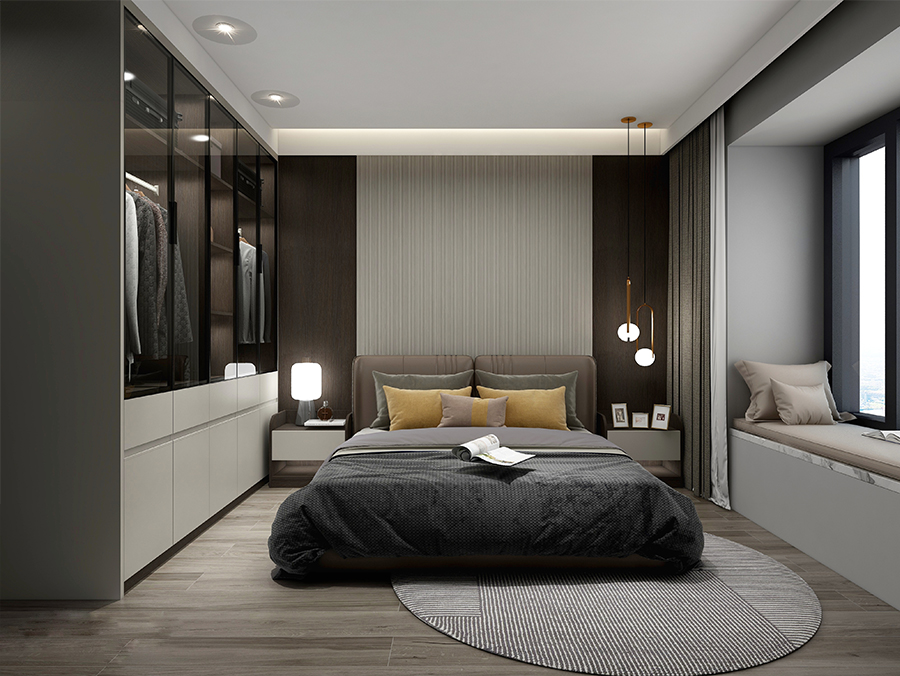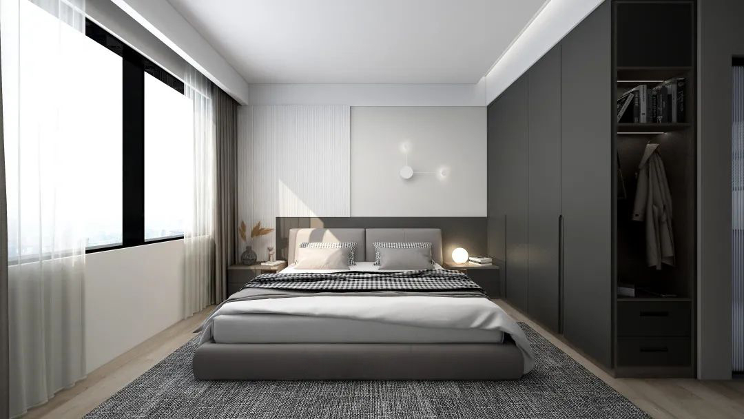 無主燈布局,干凈極簡,深灰色的衣柜延伸出同色床屏,加上灰色地毯,帶來視覺上的錯落有致。