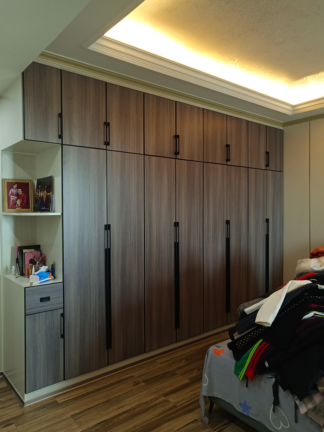 色彩可以對空間比例、面積、層次、氣質(zhì),起到加強(qiáng)或減弱的作用。像這樣,金色的加入,讓空間多了輕奢感。