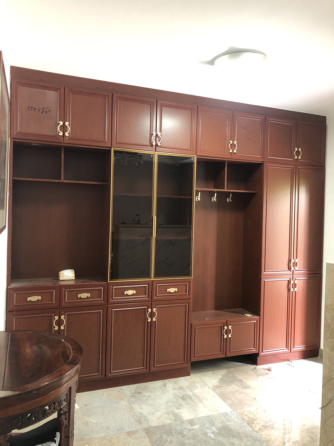 沿墻壁定制的全鋁餐邊柜+全鋁酒柜+全鋁玄關(guān)柜設(shè)計,節(jié)省空間,容量大,格調(diào)高。