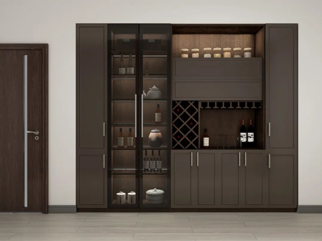 新中式多功能全鋁餐邊柜酒柜,嵌入式冰箱與全鋁酒柜完美結(jié)合,靠墻設(shè)計的全鋁酒柜,不占空間,收納容量強大。