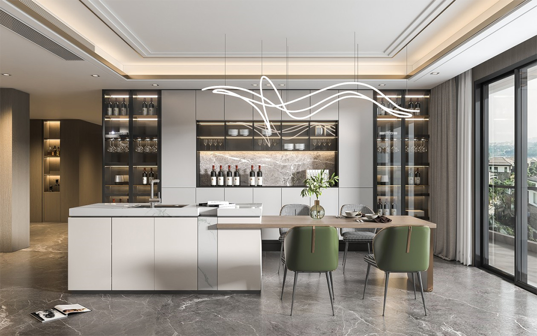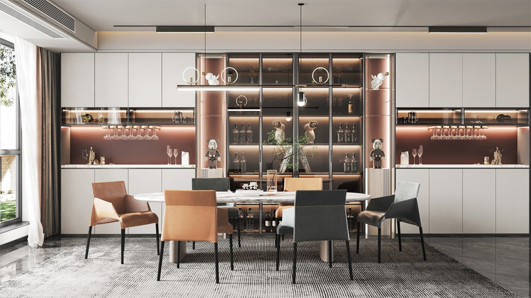 全鋁酒柜除了放酒,收納餐具、酒杯、裝飾品等也非常適合。尤其是客餐廳一體,可以大大分擔客廳的收納壓力,讓餐桌和客廳保持干凈整潔。