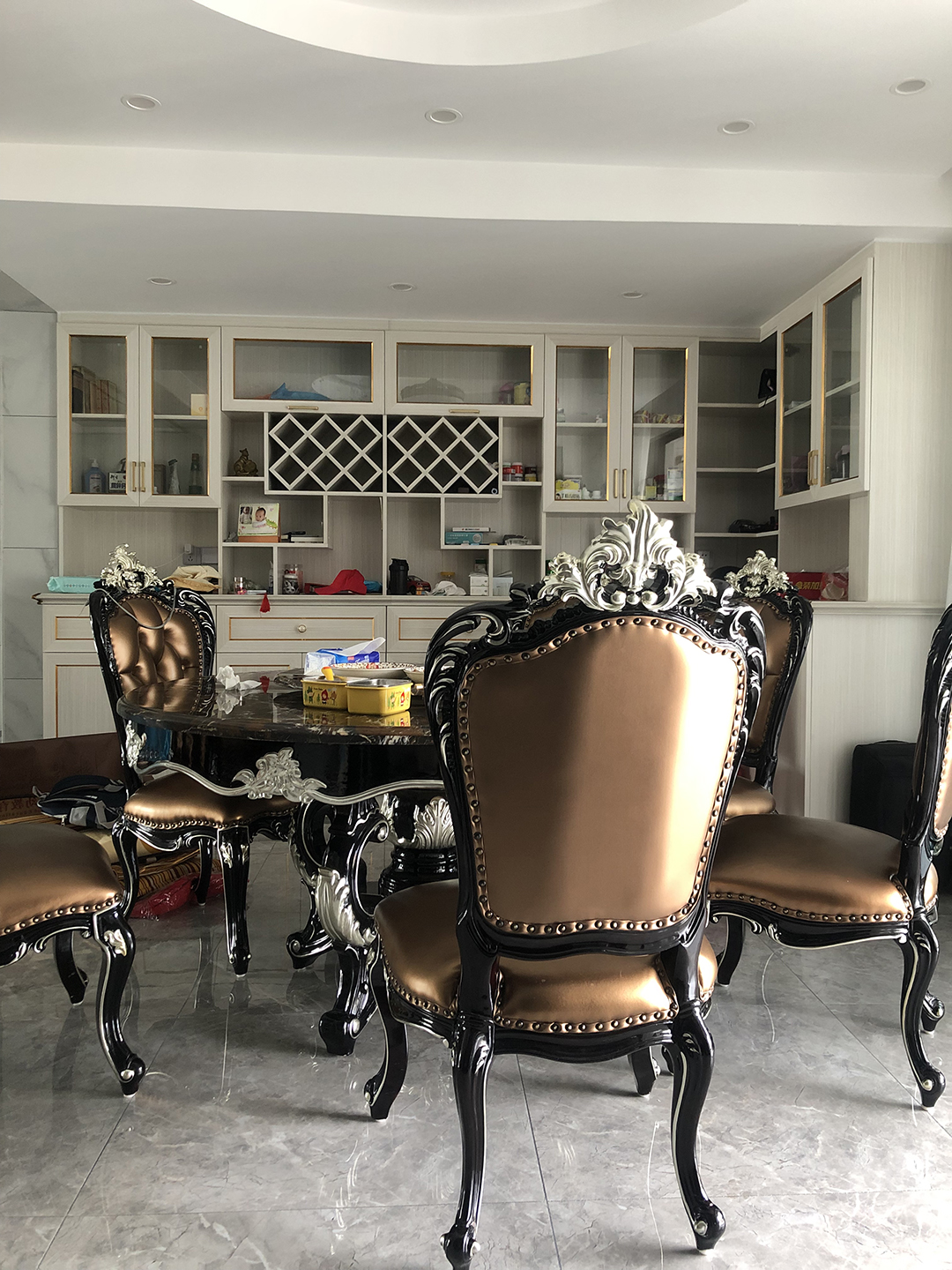 餐廳比較大,正面墻體做滿全鋁餐邊柜,全鋁酒柜自然變大。整個全鋁柜體對稱設(shè)計,盡顯端莊和大氣。