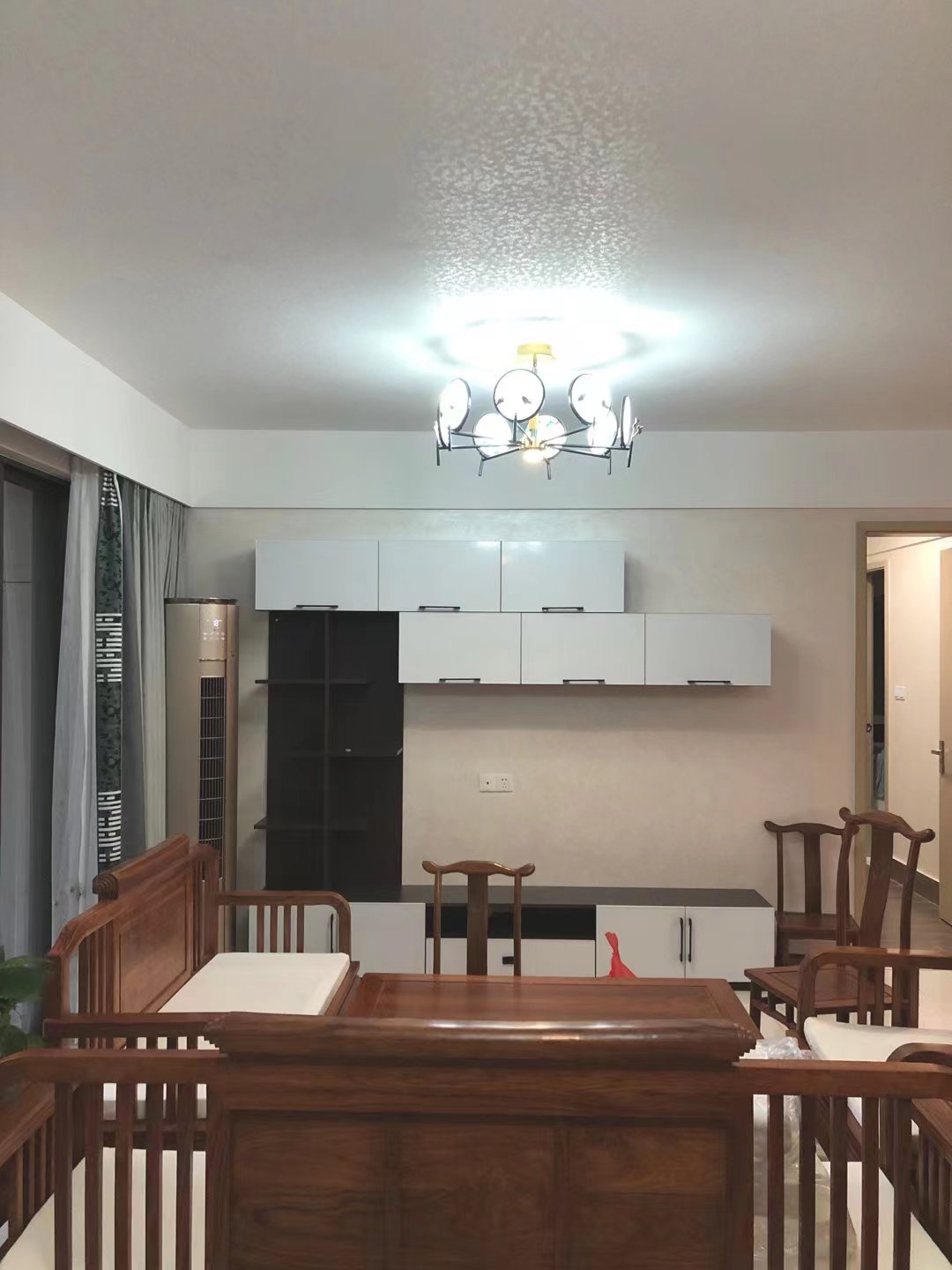 客廳的電視柜與餐邊柜色系一致,北歐紫檀柜體搭配天使白門板。電視柜采用側(cè)U型設計,左邊豎柜和上方吊柜做薄處理,豎柜中部做開放格,展示相框、書籍、綠植、工藝品等,地柜稍微做深一些,方便放一些隨手物品,更好的存放物品。