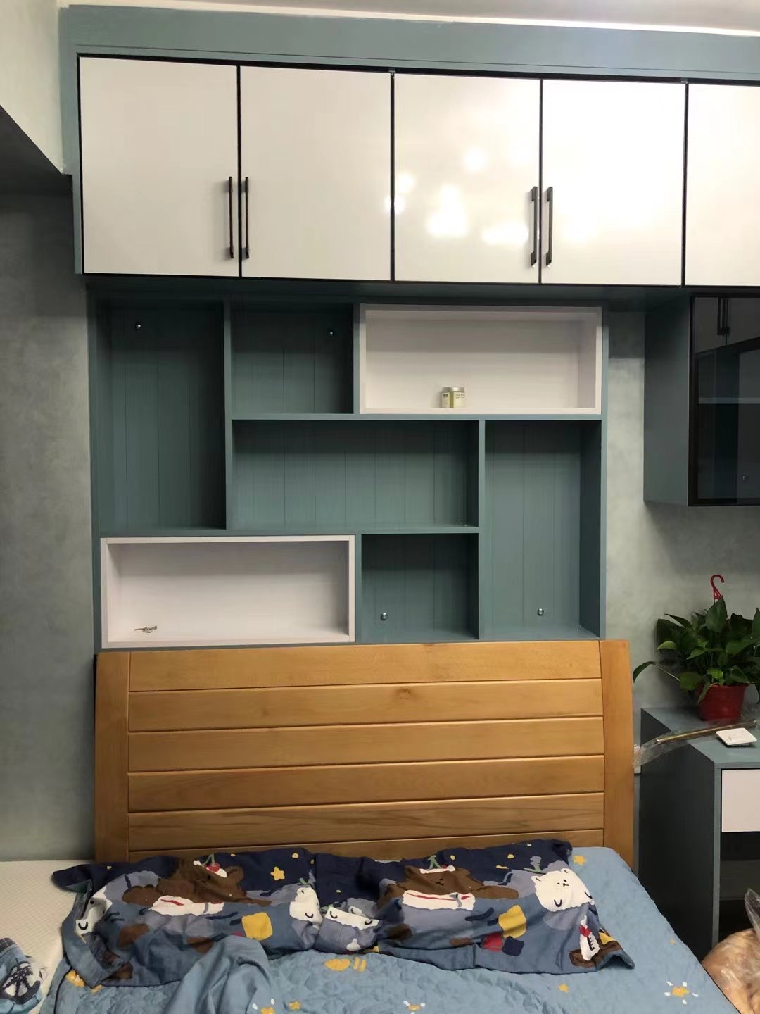 床上方的空間也不浪費,肌膚藍搭配錯落天使白開放套格,晚上看完書隨手放書籍等常用物品,非常方便。