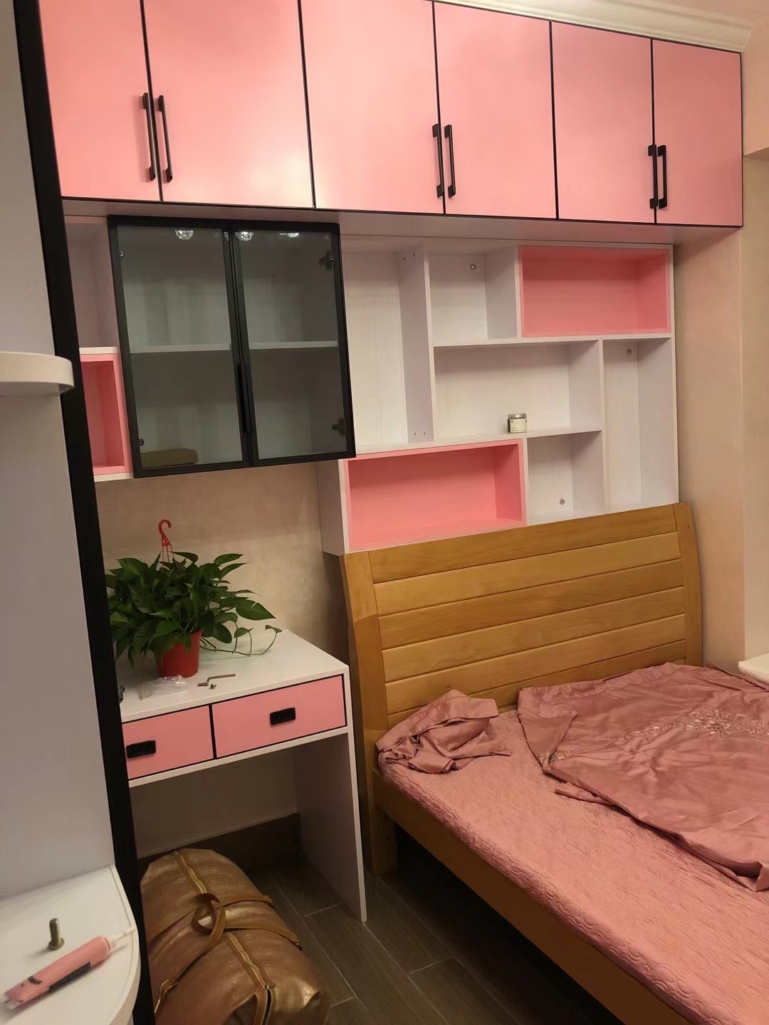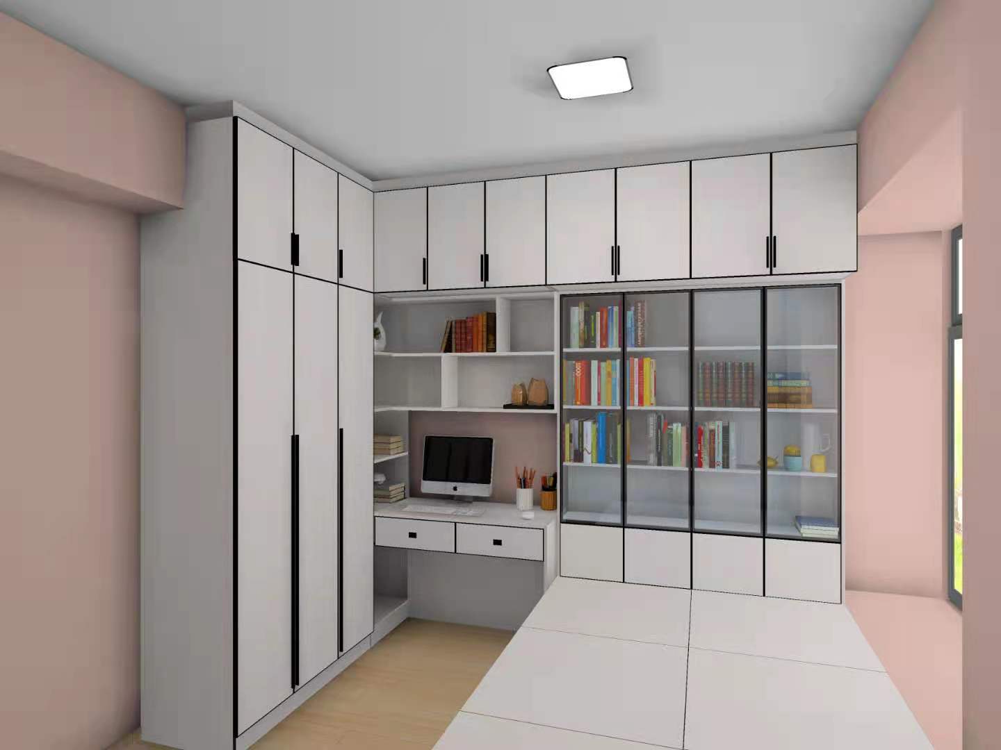 女孩房以粉色為主調(diào),柜體顏色是北歐書香桐,柜門是公主粉,營造一個浪漫的公主夢空間,書柜用玻璃門,拿取更方便,整體顏值高且實用。