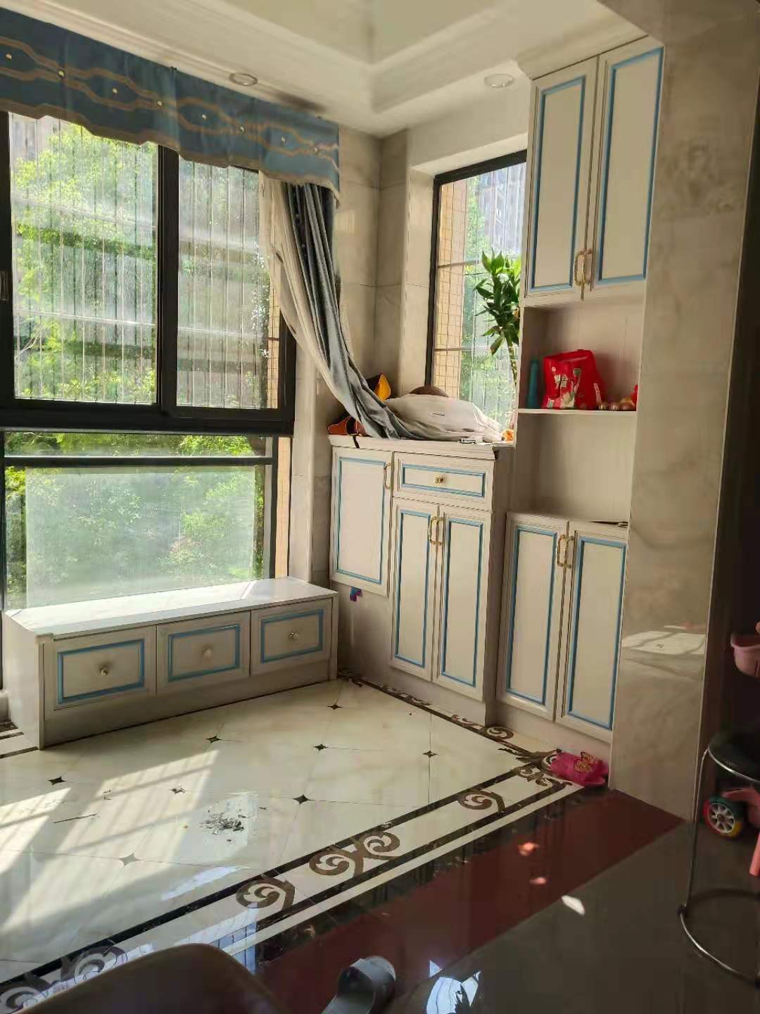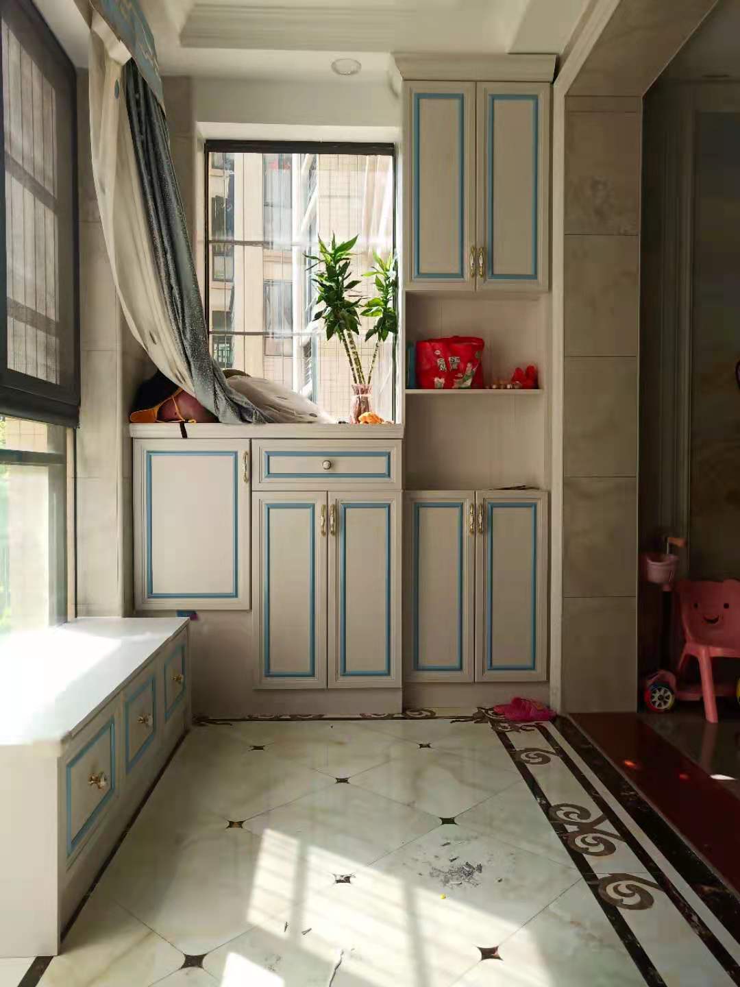 在陽臺區(qū)利用陽臺凹位定制一個嵌入式全鋁儲物柜,北歐書香桐柜體搭配45框+藍色邊框門板,去掉傳統(tǒng)歐式的繁復,簡單造型更耐看。到頂柜中間做兩個開放隔層不壓抑,旁邊地柜齊窗臺設(shè)計,靠落地窗的一邊定制了一個45公分高60公分寬的坐凳柜。
