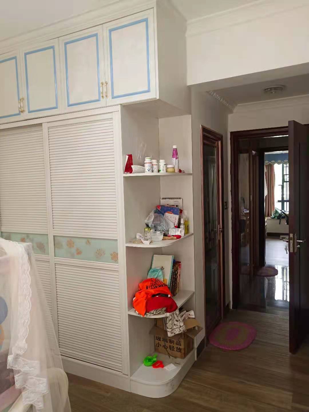 主臥的移門衣柜顏色與陽臺柜相呼應(yīng),百葉移門用玻璃腰線點綴,轉(zhuǎn)彎的一邊設(shè)計了開放格圓弧設(shè)計,不怕磕碰可以放些常用的物品,吊柜放棉被等過季衣物。