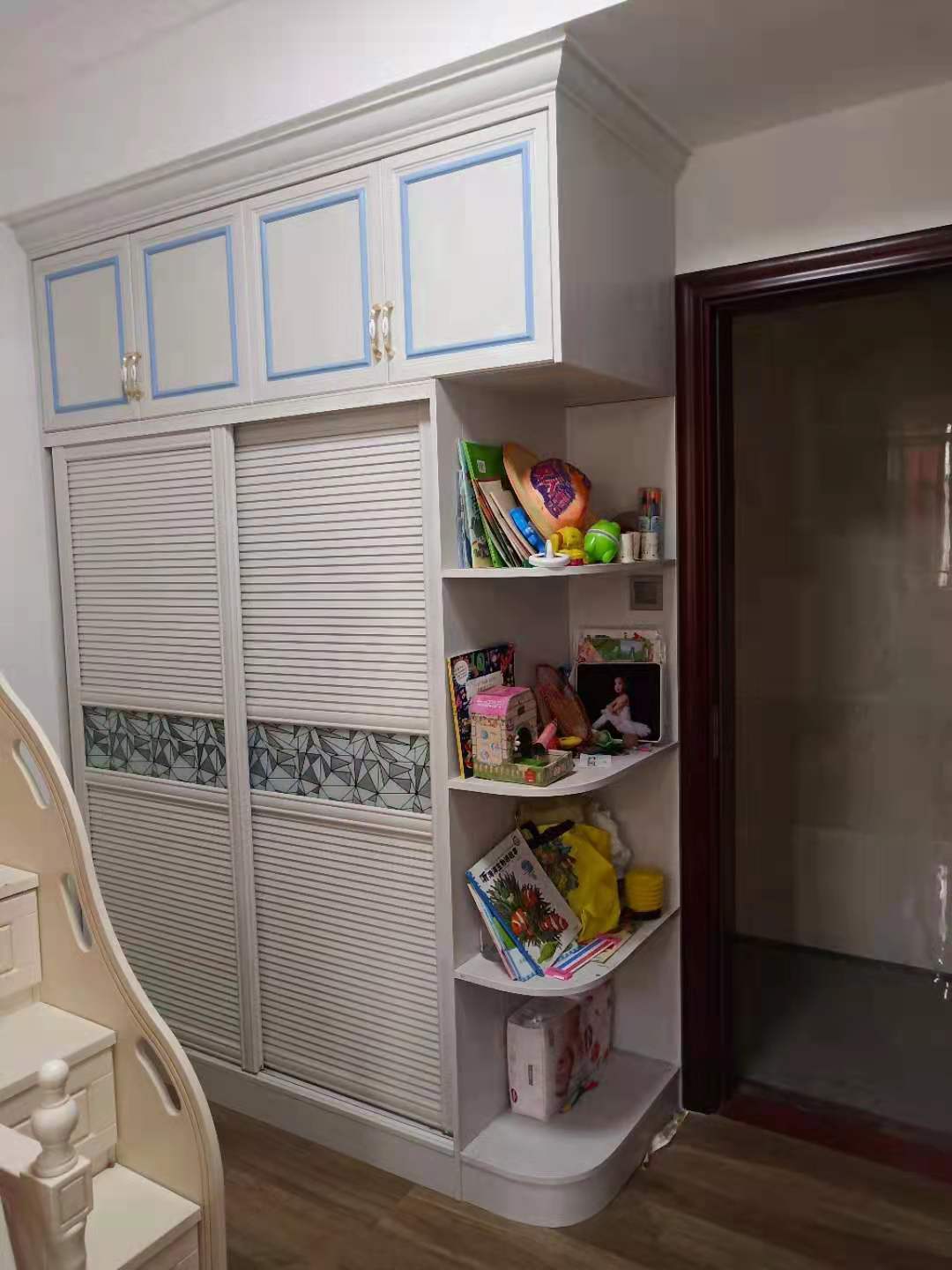 這是兒童房移門衣柜,與主臥衣柜風格一致,只是細節(jié)做了稍微變動,轉(zhuǎn)角靠門的一邊也做了圓弧設(shè)計,吊柜門板也是45框+藍色邊框門板,整屋家具整體和諧統(tǒng)一。