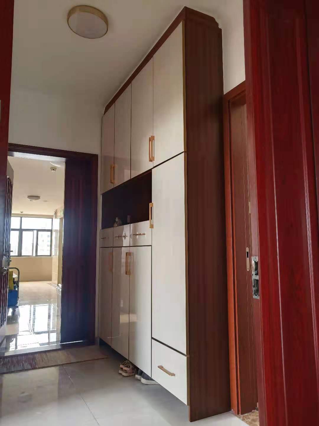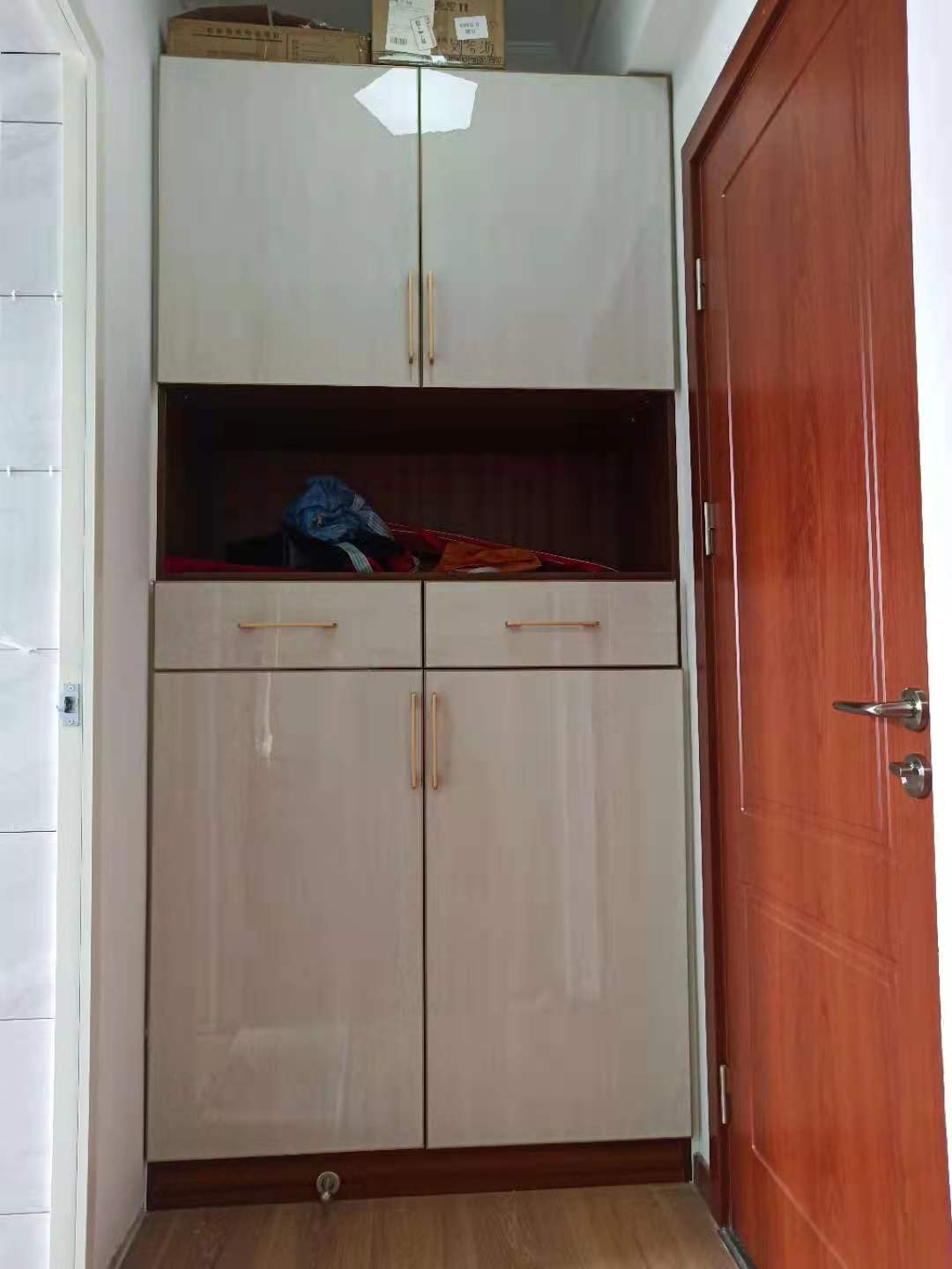 入戶玄關(guān)做了一個(gè)到頂鞋柜,柜體用焊接整板北歐柚木+白色條紋高光門板,搭配金色一字型拉手,簡約輕奢。柜子下面留空10公分放常穿的鞋,中間挖空設(shè)計(jì)隨手放手機(jī)鑰匙包包,中間一排抽屜設(shè)計(jì)可以放口罩、眼鏡等遛狗手繩等,整體收納非常足。