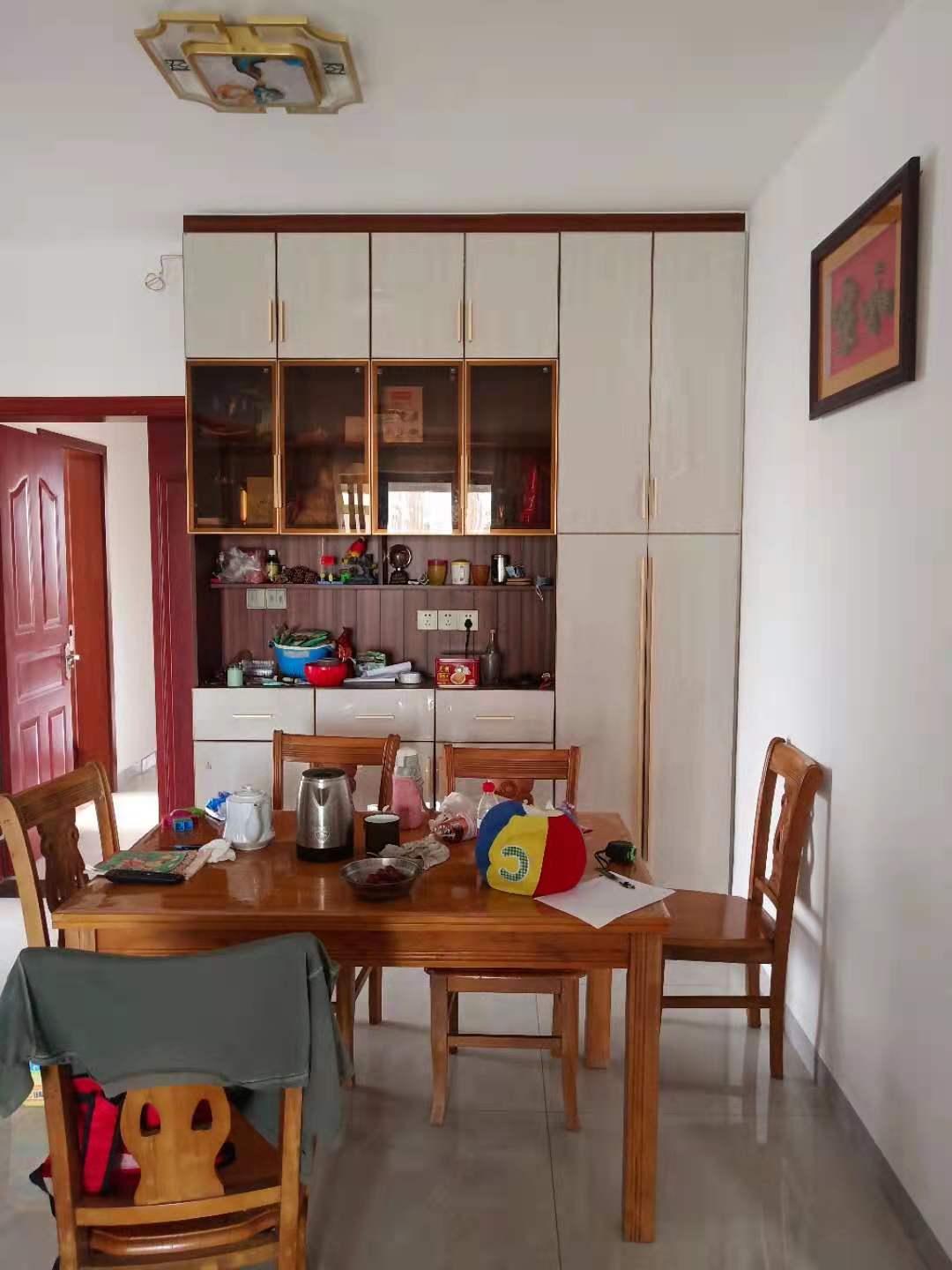 餐廳位置比較小,只夠放一張長方形木質(zhì)餐桌,利用一面墻的位置打造一個(gè)全鋁餐邊柜,餐邊柜與玄關(guān)鞋柜呼應(yīng),中間部分做了更多的開放格,同時(shí)加了玻璃門,靠近餐桌,拿取方便,一家四口坐著吃飯也非常溫馨。