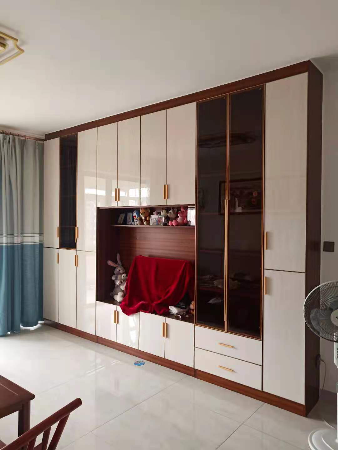 客廳做了一個(gè)超大全鋁電視柜,柜體也是全鋁焊接整板北歐柚木,門板是白色條紋高光門板+茶色玻璃門,把電視內(nèi)嵌到電視柜里,用金色邊框和金色拉手做點(diǎn)綴,盡顯輕奢質(zhì)感,業(yè)主家的兩個(gè)女兒特別喜歡公仔和玩偶,客廳的電視柜可以收納兩姐妹的各種玩具和書籍。