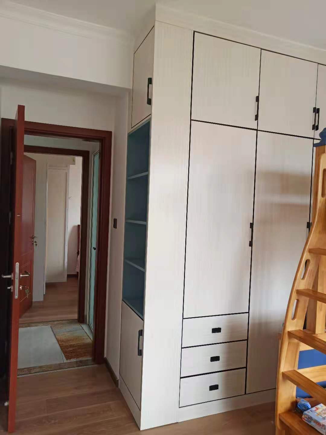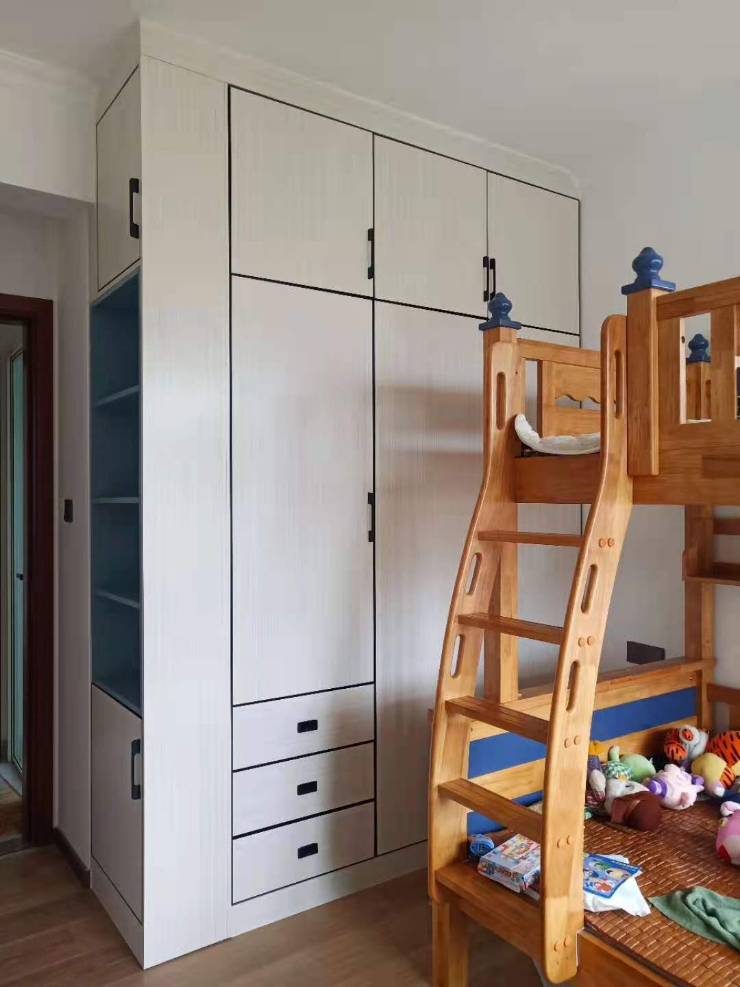 大女兒房做了一個(gè)轉(zhuǎn)角衣柜,柜體是焊接整板北歐書香桐,門板是用北歐書香桐蜂窩板做的衣柜門和抽屜門更輕便??块T的一邊做了一個(gè)整板肌膚藍(lán)內(nèi)嵌開放格做跳色,白色系柜體搭配黑色極簡邊框門板,線條感十足。