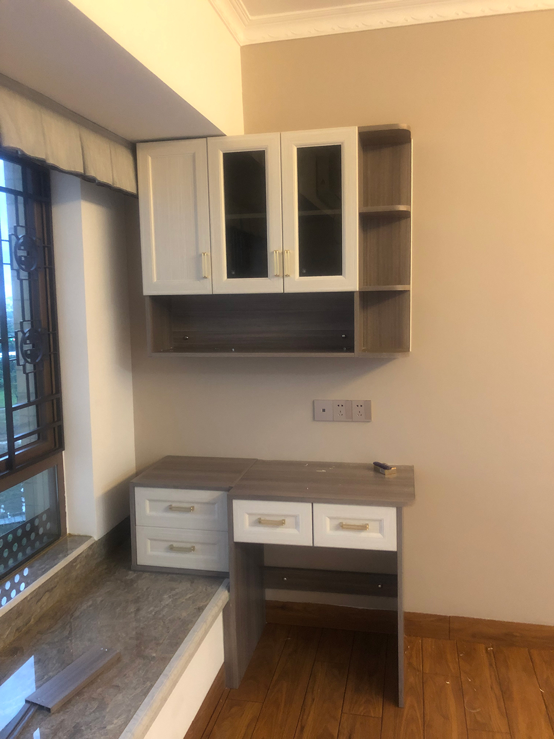 這是主人房飄窗書(shū)桌柜,書(shū)桌+吊柜組合,也可以當(dāng)梳妝臺(tái)用,一桌兩用,整個(gè)柜子顏色與衣柜相呼應(yīng)。