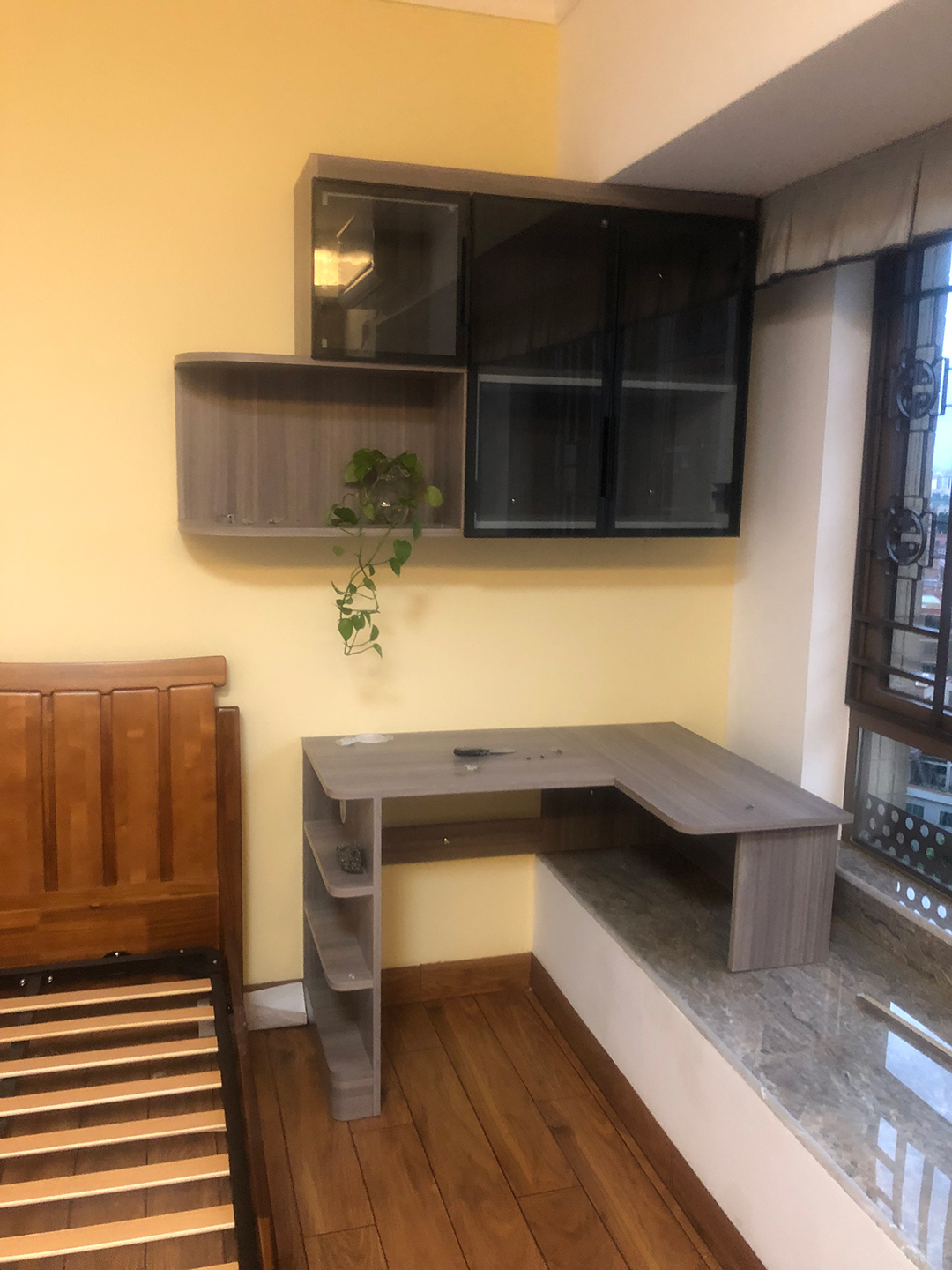在靠窗的地方也做了一個(gè)轉(zhuǎn)角書(shū)桌柜,抽屜+一邊開(kāi)放格設(shè)計(jì),收納充足,柜子風(fēng)格與整屋一致。