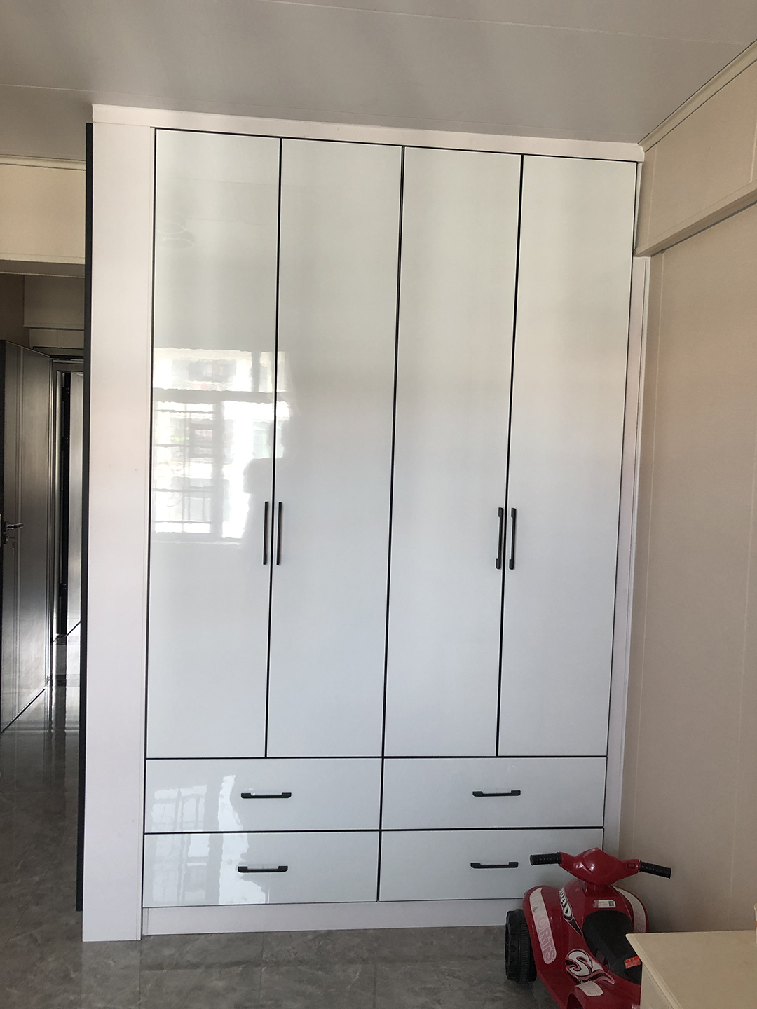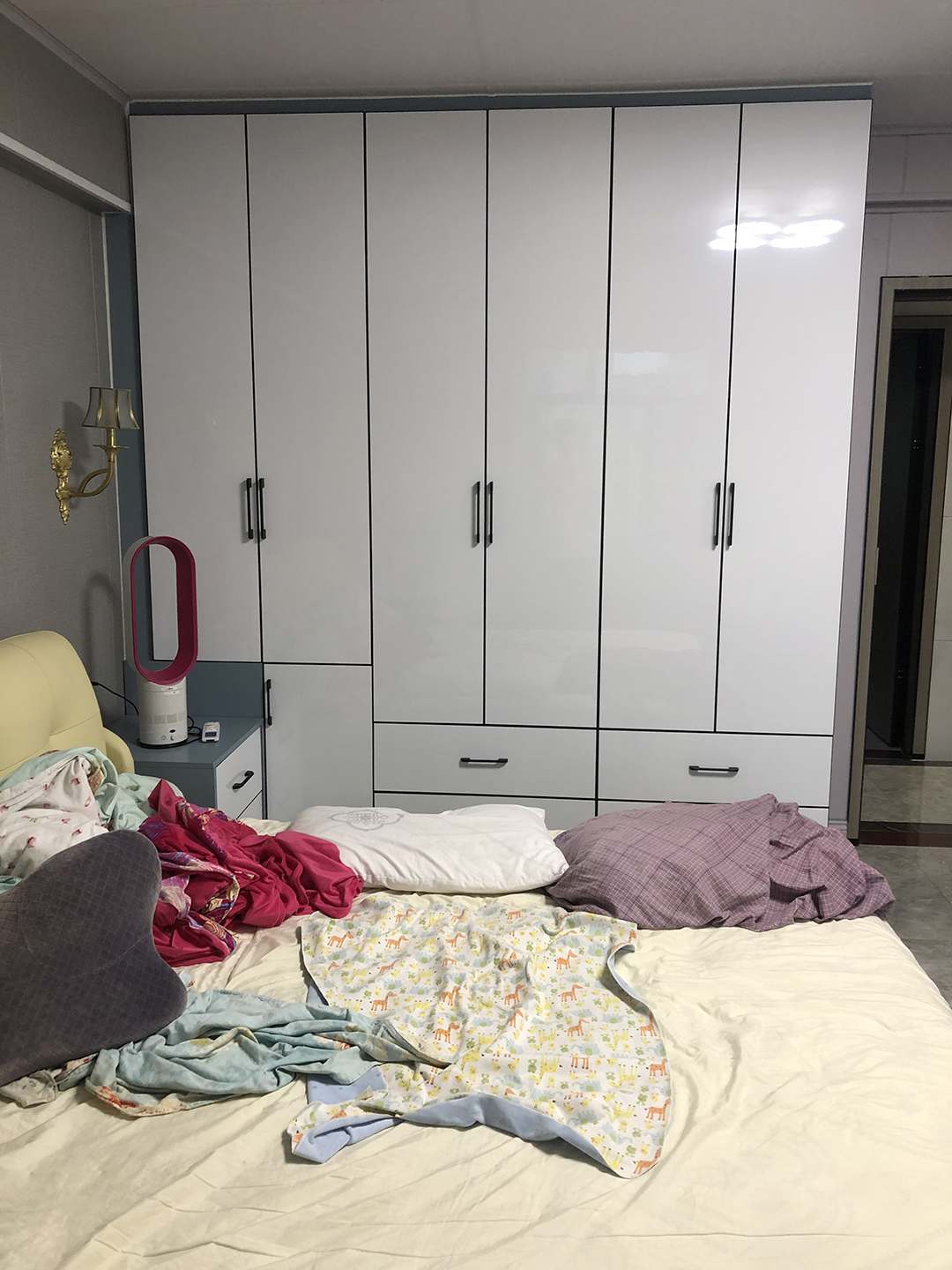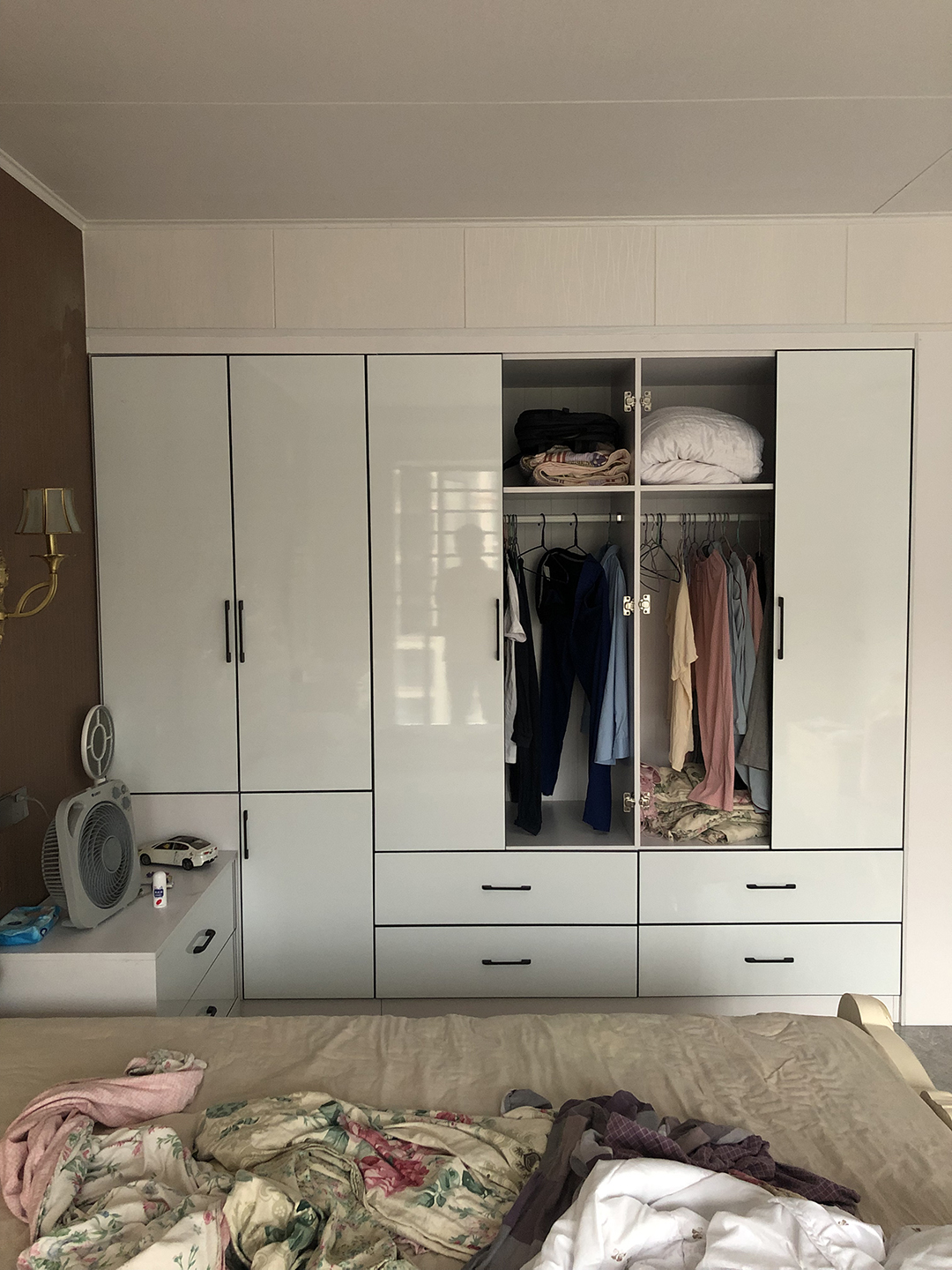 主人房做了一個(gè)到頂衣柜+床頭柜,柜體是焊接整板天使白,門(mén)板是高光水晶白搭配黑色拉手,極簡(jiǎn)風(fēng)格,中間做了兩扇玻璃門(mén)整體不沉悶。