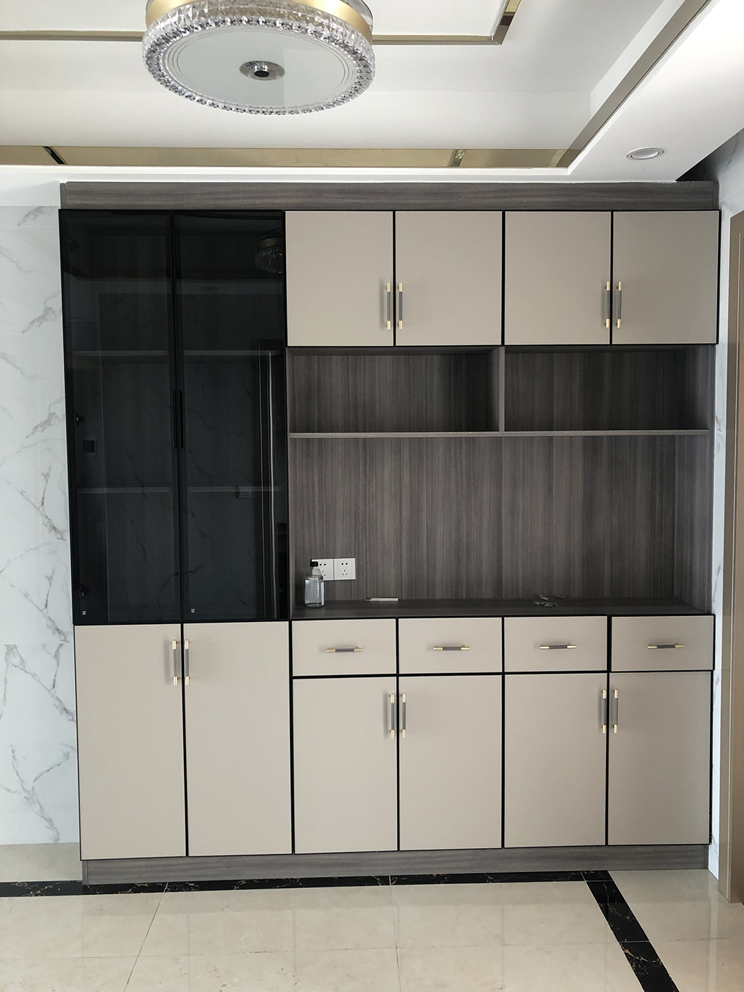 柜體采用焊接整板北歐松木灰,門板用膚感卡其搭配黑色窄邊框,金色圓管小拉手時(shí)尚又簡約。餐邊柜中間挖空,可作為入戶中轉(zhuǎn)站放包包鑰匙等解放雙手,下柜以封閉式掩門為主,可充當(dāng)鞋柜,上方以半開放式為主,玻璃門擋住灰塵,但擋不住主人收藏品的展示。