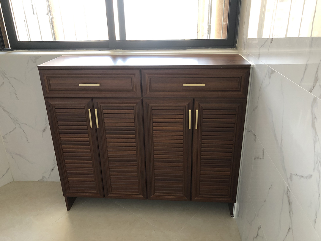 在客餐廳拐角處設(shè)計(jì)一個(gè)與窗齊平的簡易全鋁鞋柜增加全家人的鞋子收納,柜體和門板都是北歐柚木,真百葉門板設(shè)計(jì),透氣佳!
