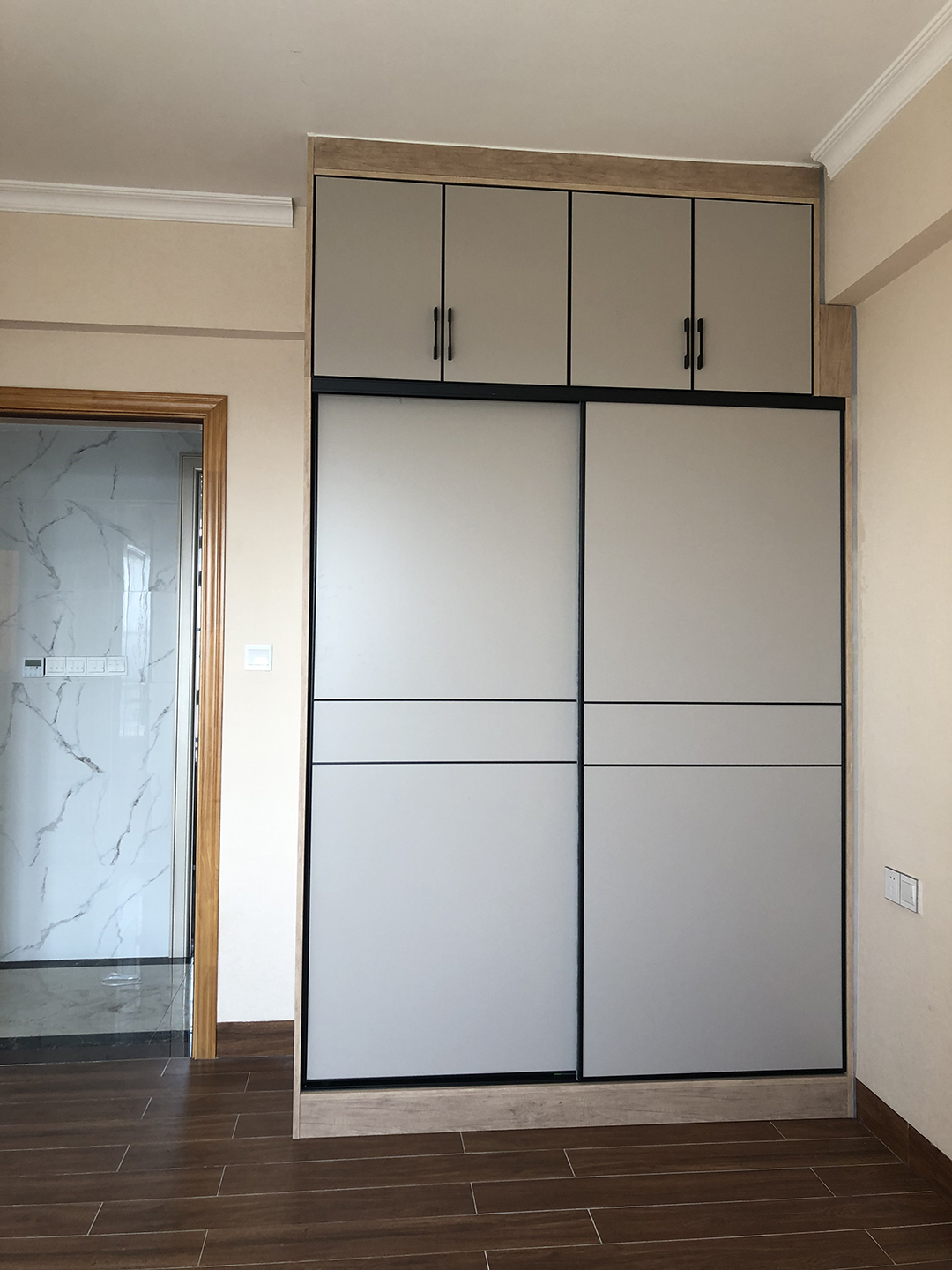 兒子房衣柜采用掩門設(shè)計(jì),柜體是焊接整板北歐松木灰,門板與整屋相呼應(yīng),膚感卡其門板搭配一字型黑色長拉手,簡約又時(shí)尚!