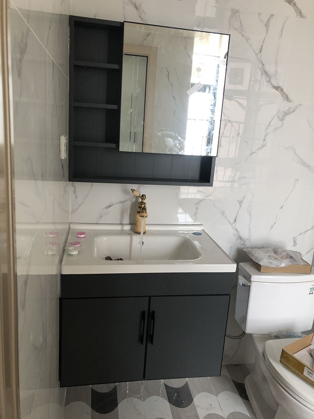 公衛(wèi)也采用壁柜式全鋁浴室柜,柜體和門板都是星空灰,鏡柜增加收納,全鋁浴室柜防水防潮防蟲蛀,結(jié)實(shí)耐用不變形。
