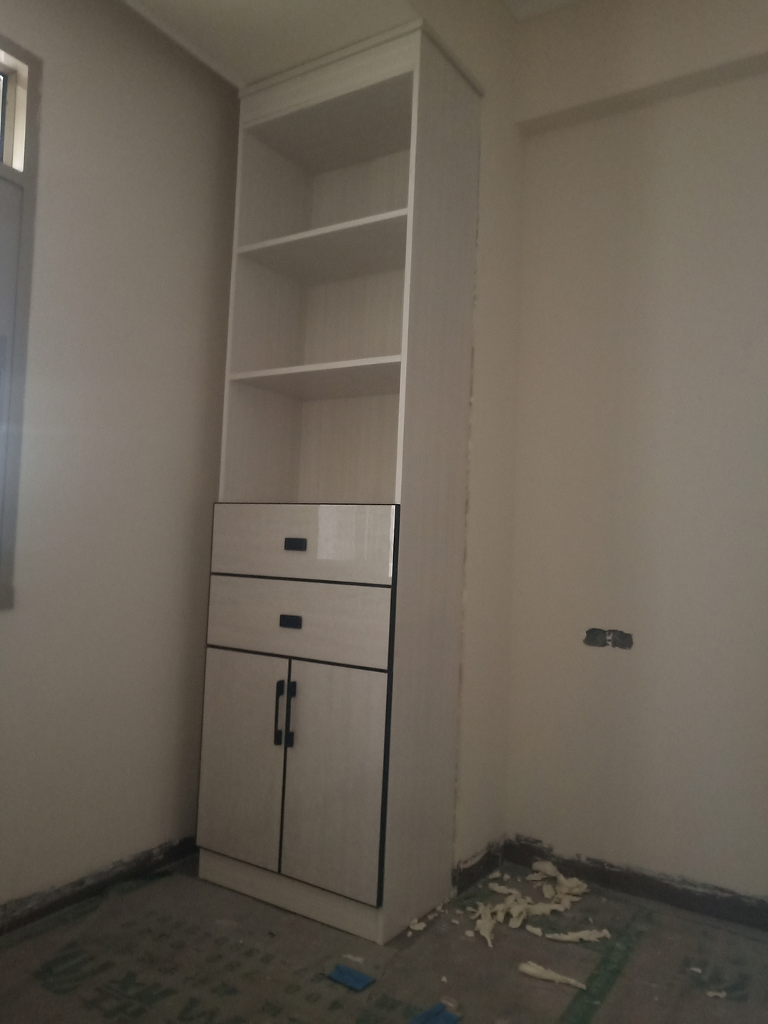 女兒房與兒子房一樣有個凸起的地方也做了展示柜,下柜做成封閉式,上柜做成開放式,放裝飾品等綠植,整體不壓抑。