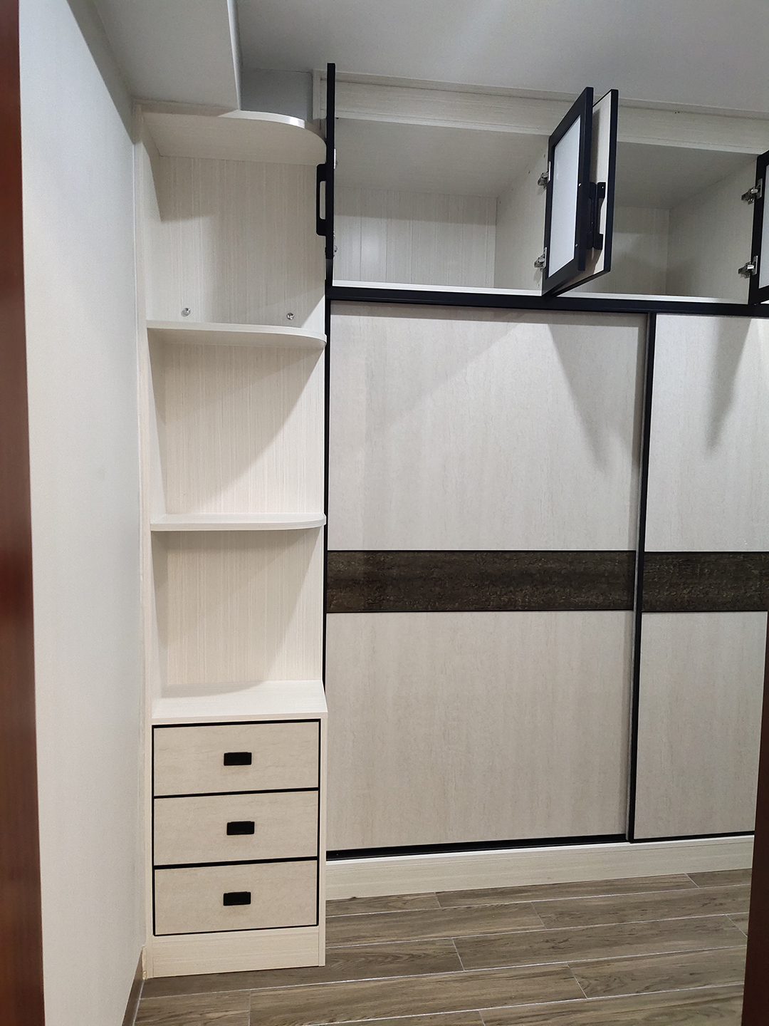 主人房定制了一個衣柜+書桌柜組合,柜體是北歐書香桐,門板是極簡黑框+006高光板,線條感十足!吊柜放棉被等過季衣物,書桌上方做了開放格放書等裝飾品,書桌也可以當(dāng)梳妝臺用,抽屜放化妝品,一舉兩得!