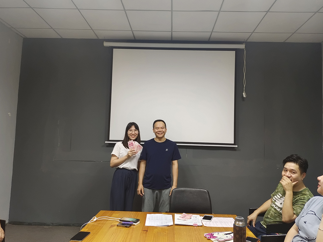 最后,到了激動人心的時刻,給上個月完成目標(biāo)和超額完成目標(biāo)的同事發(fā)獎金,業(yè)務(wù)部是最能鍛煉人的地方,也是個人成長最快的部門,越努力越幸運,望業(yè)務(wù)部全體員工再接再厲,年底賺更多的錢回家過年,一起加油!