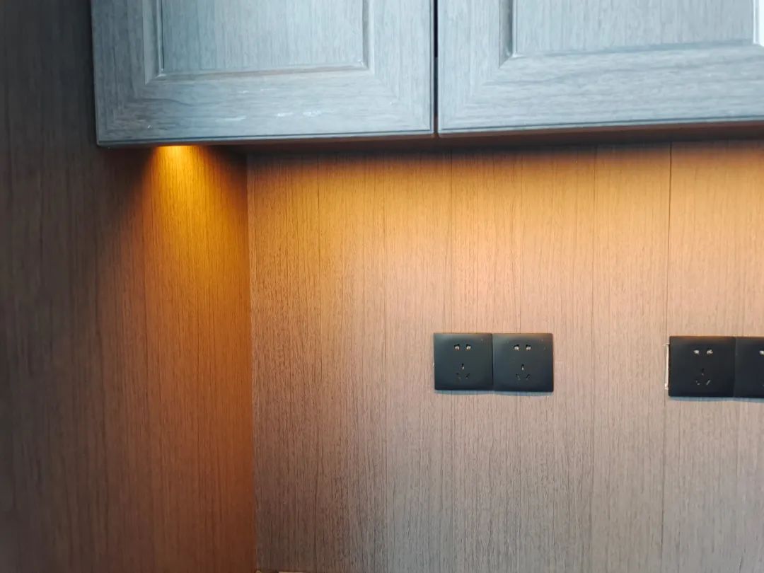 柜體中采用的隱藏式燈帶,暖黃色燈光是整個柜體的靈魂之處,燈光照射在柜板上,營造出溫馨和虛實對比的視覺感,使整個餐邊柜氛圍感拉滿。