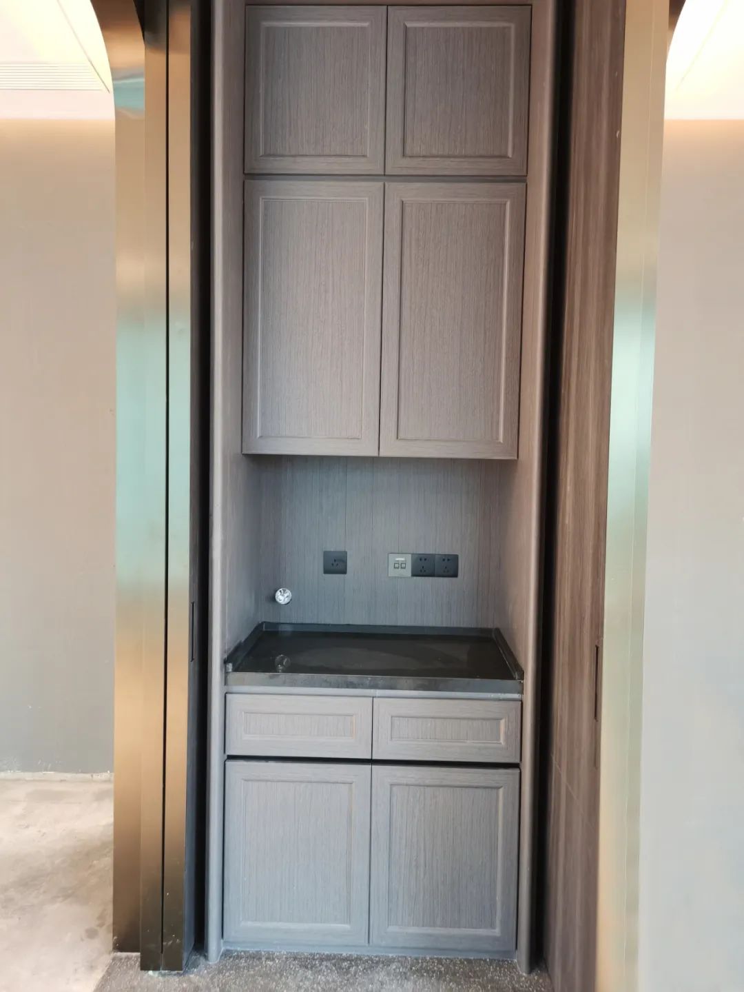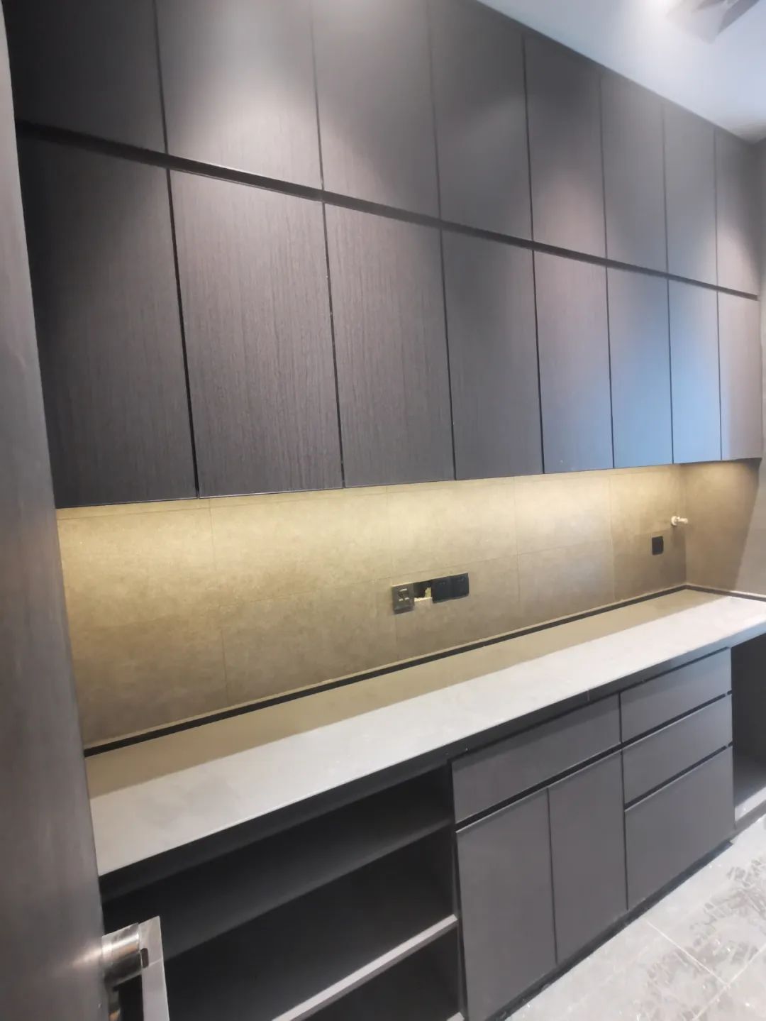 柜門設計的是隱形免拉手,一來防止開關夾傷,二來隱藏式設計顏值和實用并存,由此可見設計師的心思細膩。