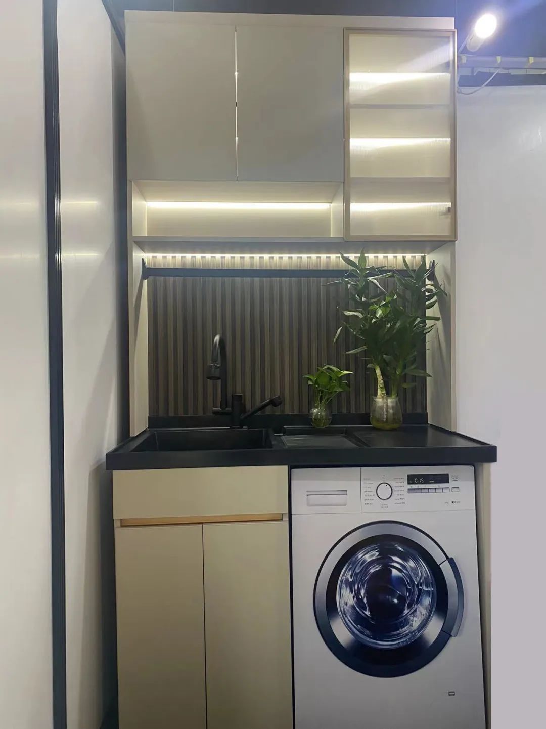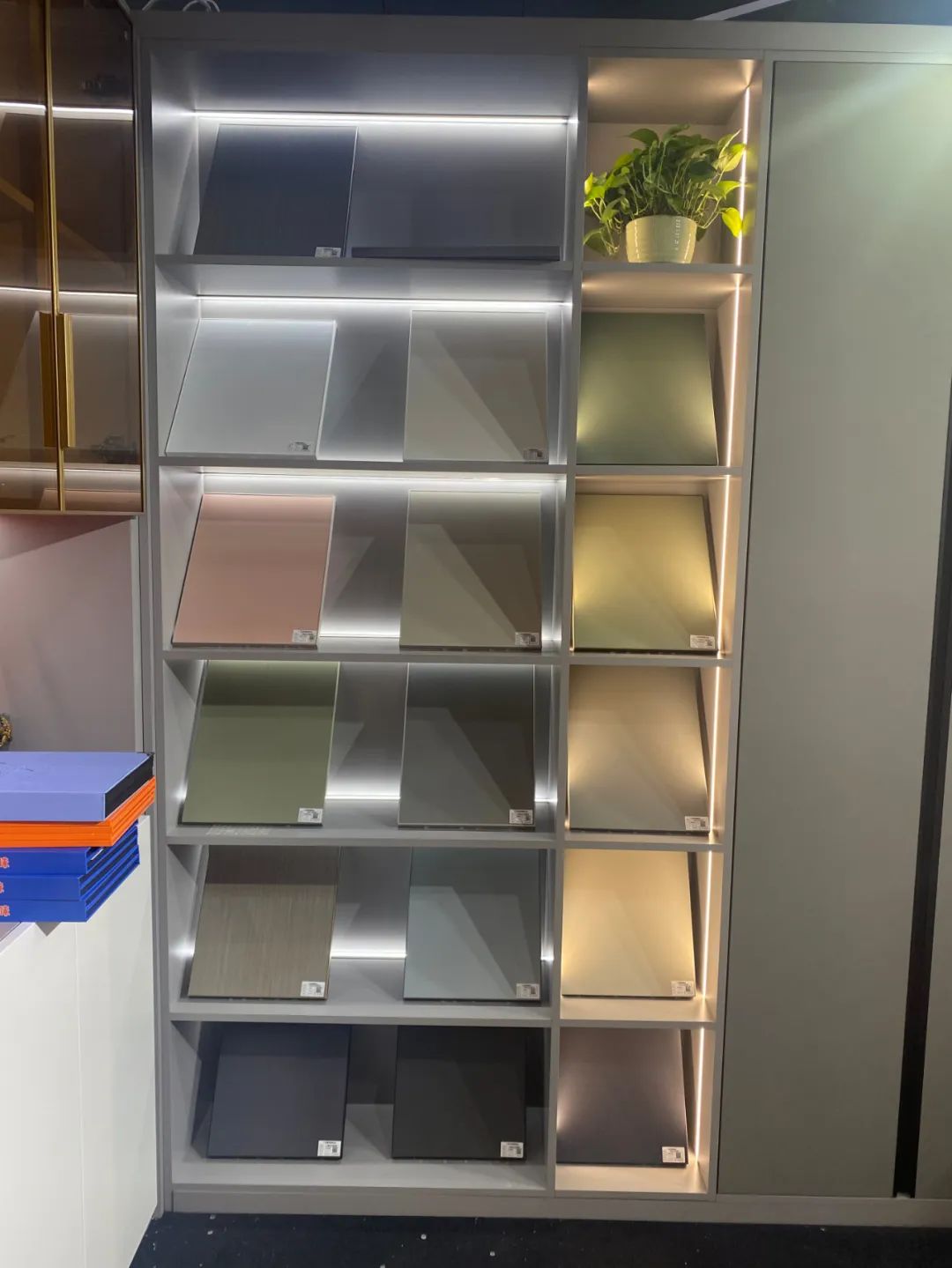 儲(chǔ)物柜體選色來自新研發(fā)莫蘭迪系列膚感淺灰大板,鋁型材用的是航空板,耐用、抗壓不變形。中間擺放的是各種顏色的門芯和柜門板材,柜體中的燈帶照在門板上,暖與簡(jiǎn)、色與色的包容碰撞,解鎖高級(jí)美感。