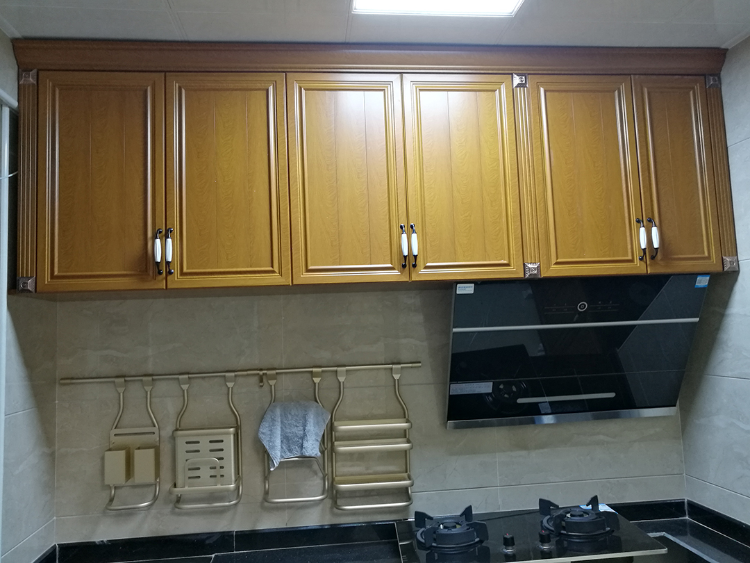 也可以做這種木紋色系的全鋁吊柜和地柜,簡單實(shí)用。廚房裝吊柜和地柜是小戶型的首選,充分利用空間!