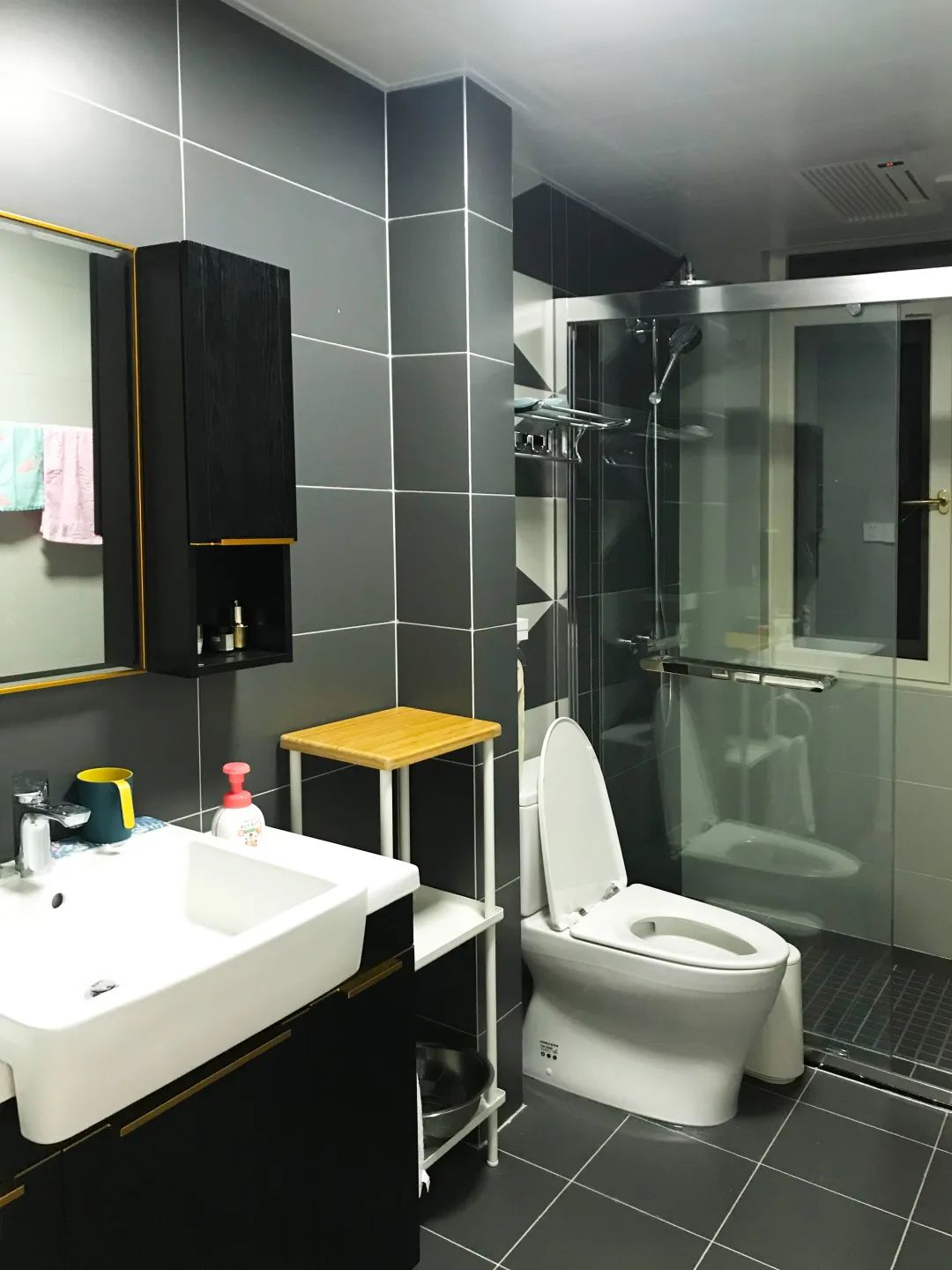 而衛(wèi)生間的重點(diǎn)就是清潔度,在墻面選色上,建議以清潔感較強(qiáng)的冷色調(diào)或黑灰色為佳(特別提醒:不要選白地磚,特顯臟),至于浴室柜、浴缸、浴簾等配置,選擇同類色或鄰近色便可。